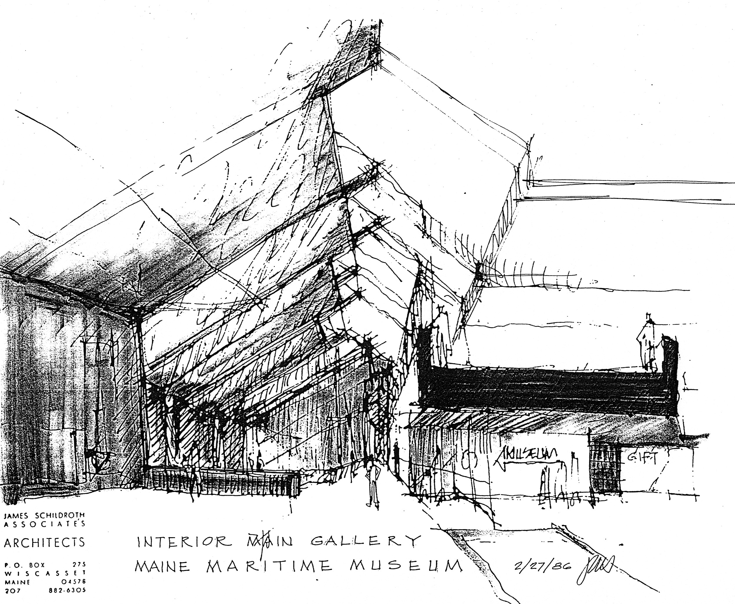 Interior sketch of the main gallery. The design put all the exhibits in one